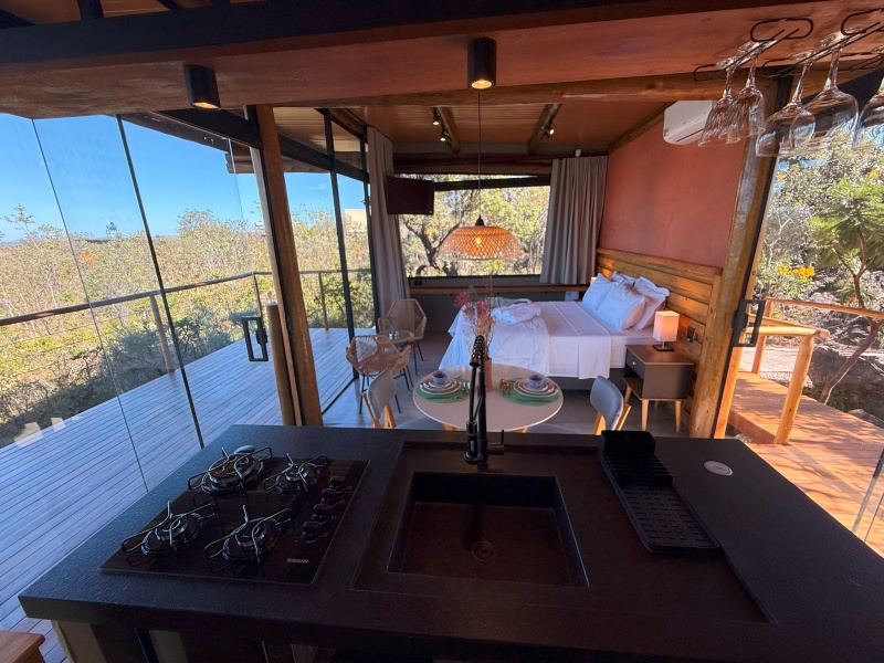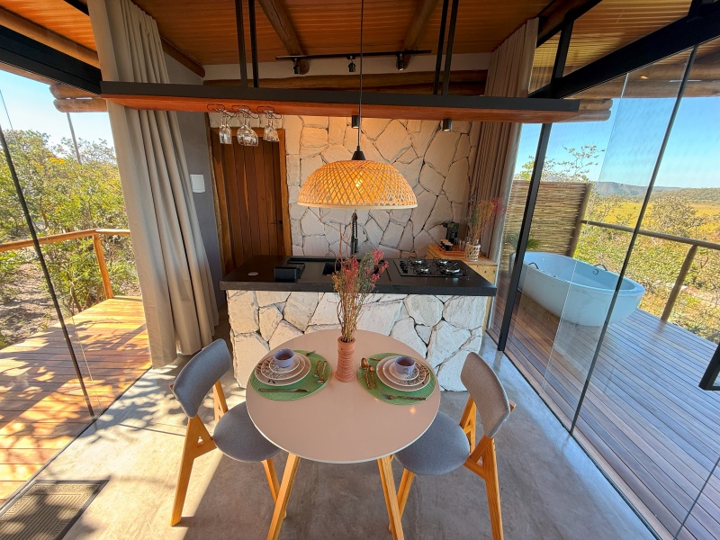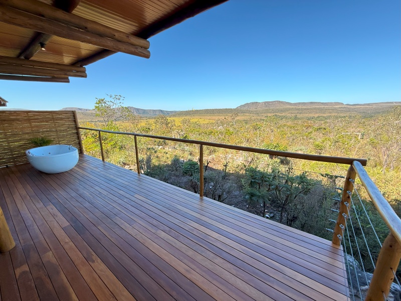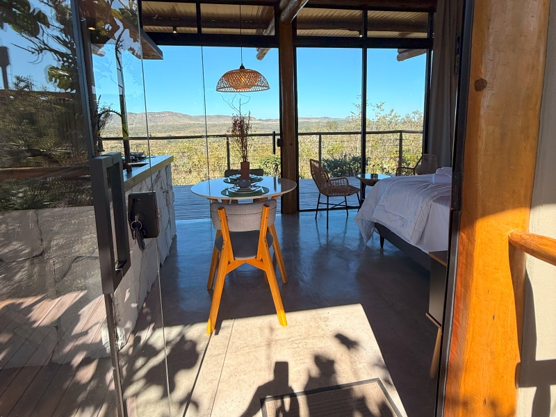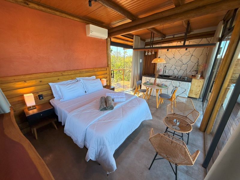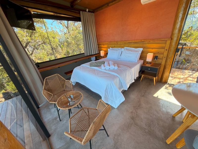 Experimente o conforto e o charme da Chapada dos Veadeiros em nossos chalés com arquitetura rústica e aconchegante, ideais para casais ou viajantes que buscam tranquilidade e contato com a natureza. Cada chalé pode oferecer uma vista panorâmica deslumbrante do Morro da Baleia e Morro do Buracão — cenário perfeito para relaxar e se desconectar.